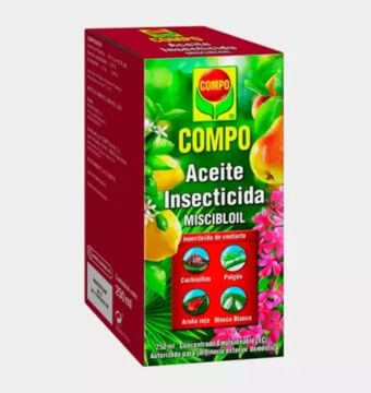 El Aceite Mineral Miscibloil de Compo es un insecticida ecológico que protege a las plantas de diferentes tipos de plagas, como la araña roja, el pulgón, la mosca blanca y la cochinilla. Es eficaz porque forma una fina película protectora sobre las plantas, impidiendo que los insectos se puedan alimentar de las hojas.