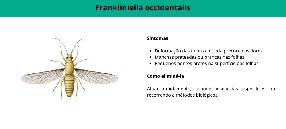 A Frankliniella occidentalis deixa manchas prateadas ou brancas nas folhas e podem ser observados pequenos pontos pretos (os seus excrementos) na superfície das folhas. Além disso, ao agitar ligeiramente a planta sobre uma folha de papel branca, é possível ver pequenos insetos a mover-se.